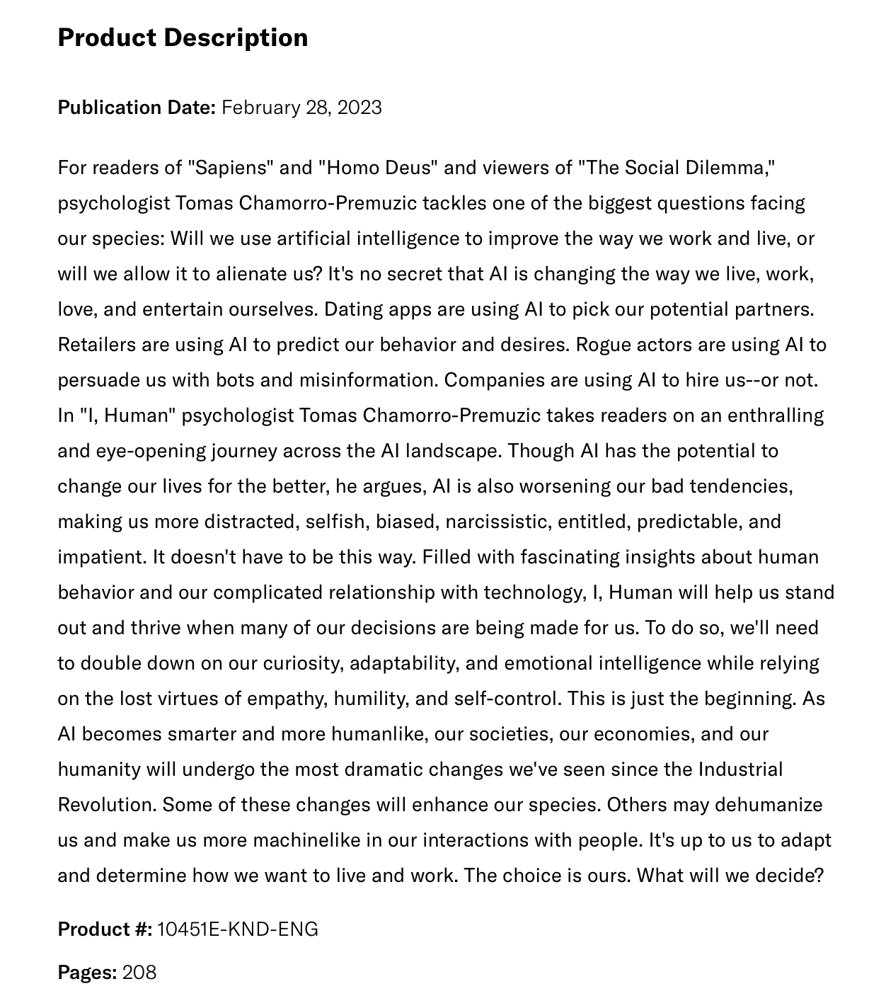 L'uso dell'Intelligenza Artificiale nei motori di ricerca, nei social media e nei gadget, secondo l'Autore, fa parte di uno sforzo delle aziende tecnologiche per raccogliere attenzione e denaro identificando e manipolando i modelli di comportamento umano. L'AI, sostiene Chamorro-Premuzic, spinge gli utenti a fare scansioni e clic in modi prevedibili e routinizzati; riduce l'attenzione e la pazienza con un sovraccarico di informazioni; rafforza i pregiudizi (gli algoritmi di assunzione di persone sul luogo di lavoro, per esempio, possono ricreare i pregiudizi razziali dei capi); e alimenta il narcisismo corteggiando l'ossessione per i "like" raccolti dai selfie e dai contenuti diffusi dagli utenti.
